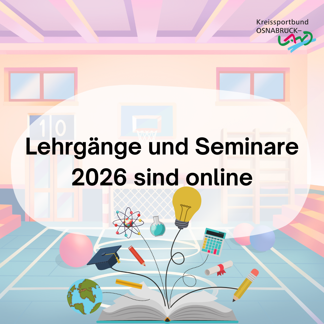 Juleica, 30.03.-04.04.: Anmeldung Sportassistenz-Ausbildung, 12.10.-15.10.2026: Anmeldung Und viele weitere Veranstaltungen findet ihr im Veranstaltungskalender auf unserer Homepage. Unter der Filterfunktion „Bezirk“ findet ihr sowohl unter Kreissportbund Osnabrück-Land als auch unter Stadtsportbund Osnabrück Veranstaltungen in unserer Region. |